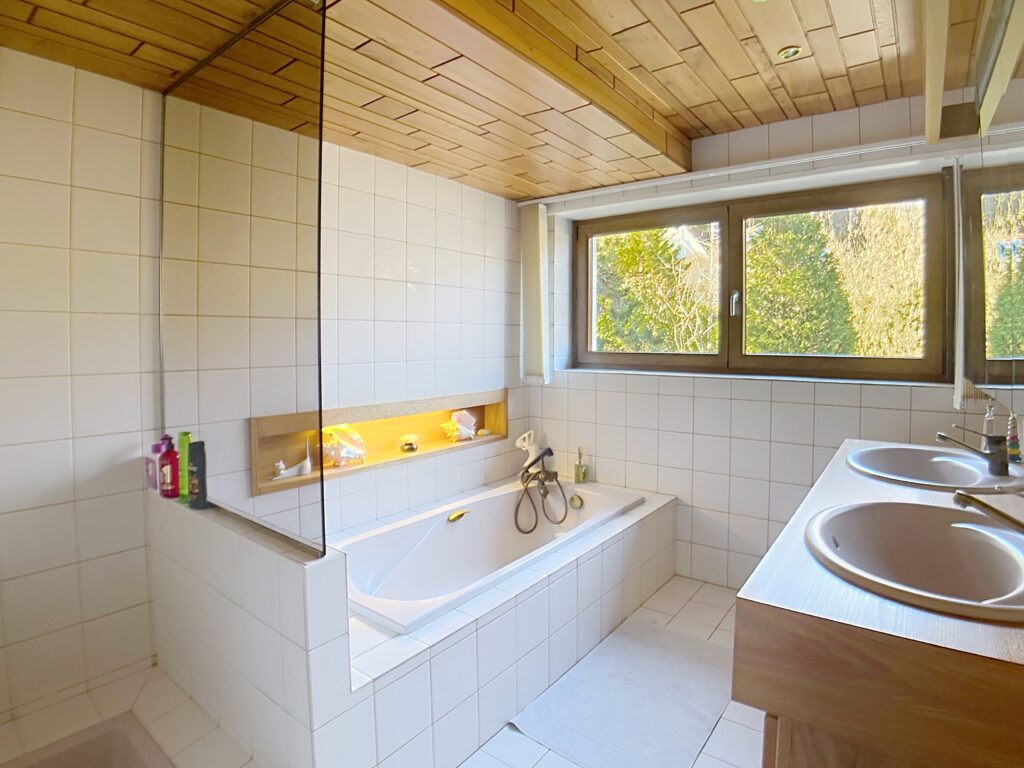 • Une salle de bains avec douche, baignoire et double vasque, •